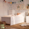 Materiales: Cama fabricada en MDF (placas de fibra de madera de media densidad) laqueados en poliuretano no tóxico de primera calidad. Partes internas fondeadas, elásticos realizados en pino, exterior laqueado en poliuretano. Opción de frente de carro enchapados en guatambú o paraiso.